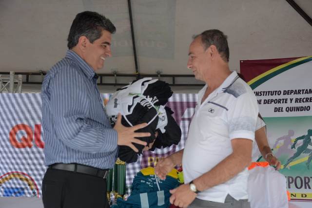 El gobernador del Quindío Padre Carlos Eduardo Osorio Buriticá entregó uniformes deportivos y trofeos a los ganadores de la fase municipal de los ‘Juegos Veredales’. 1.200 deportistas de 76 veredas de los 12 municipios quindianos participaron de estas actividades deportivas en las disciplinas de fútbol masculino, fútbol de salón femenino y masculino, tejo y sapo mixto. Con esta iniciativa el gobierno departamental busca promover el buen uso del tiempo libre y propiciar espacios de sano esparcimiento para la población rural del Quindío. En el marco de la premiación el mandatario seccional resaltó la importancia de estimular actividades dirigidas a la población rural y campesina. “Sabemos que allí tenemos jóvenes que están tentados constantemente a hábitos nocivos. Queremos promover el deporte, porque es una forma de garantizar que van a seguir siendo sanos”, agregó el Padre Carlos Eduardo Osorio Buriticá. Por su parte, Fernando Mu?oz Sánchez, habitante de la vereda Chagualá de Salento y participante de la actividad, expresó: “En hora buena el gobernador y la gerente de Indeportes reorganizaron los juegos campesinos, para que no solo sea el azadón, el machete, el trabajo, el sol y recolectar cosechas nuestro diario vivir, sino que tengamos espacios como este para la recreación y buen uso del tiempo libre”.Los campeones de la fase municipal se dividirán en tres zonas para poder realizar un zonal departamental, donde se elegirán las personas que disputarán la fase final. Es decir, que durante todo el a?o se vivirá esta actividad deportiva en el departamento.